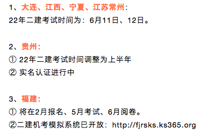 截至目前,已有4地明确了2022年二建考试时间,江苏常州、江西、宁夏、辽宁大连2022年二建考试于6月11日至12日开考,其余地区2022年二建考试暂未通知。
