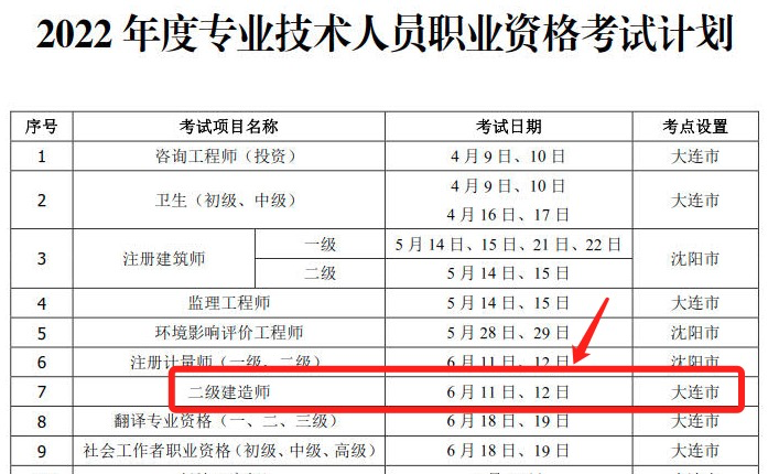 1月20日,大连市人力资源和社会保障局发布《2022年度专业技术人员职业资格考试计划》,确定了大连市2022年各项资格考试的考试时间,其中2022年度二建考试时间定在了6月11日至12日。
