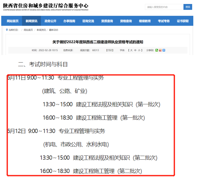 陕西省2022二建考试将于6月11、12日分2天2个批次举行。《建设工程法规及相关知识》作答时间由2小时调整为1.5小时,《建设工程施工管理》和《专业工程管理与实务》作答时间均由3小时调整为2.5小时。